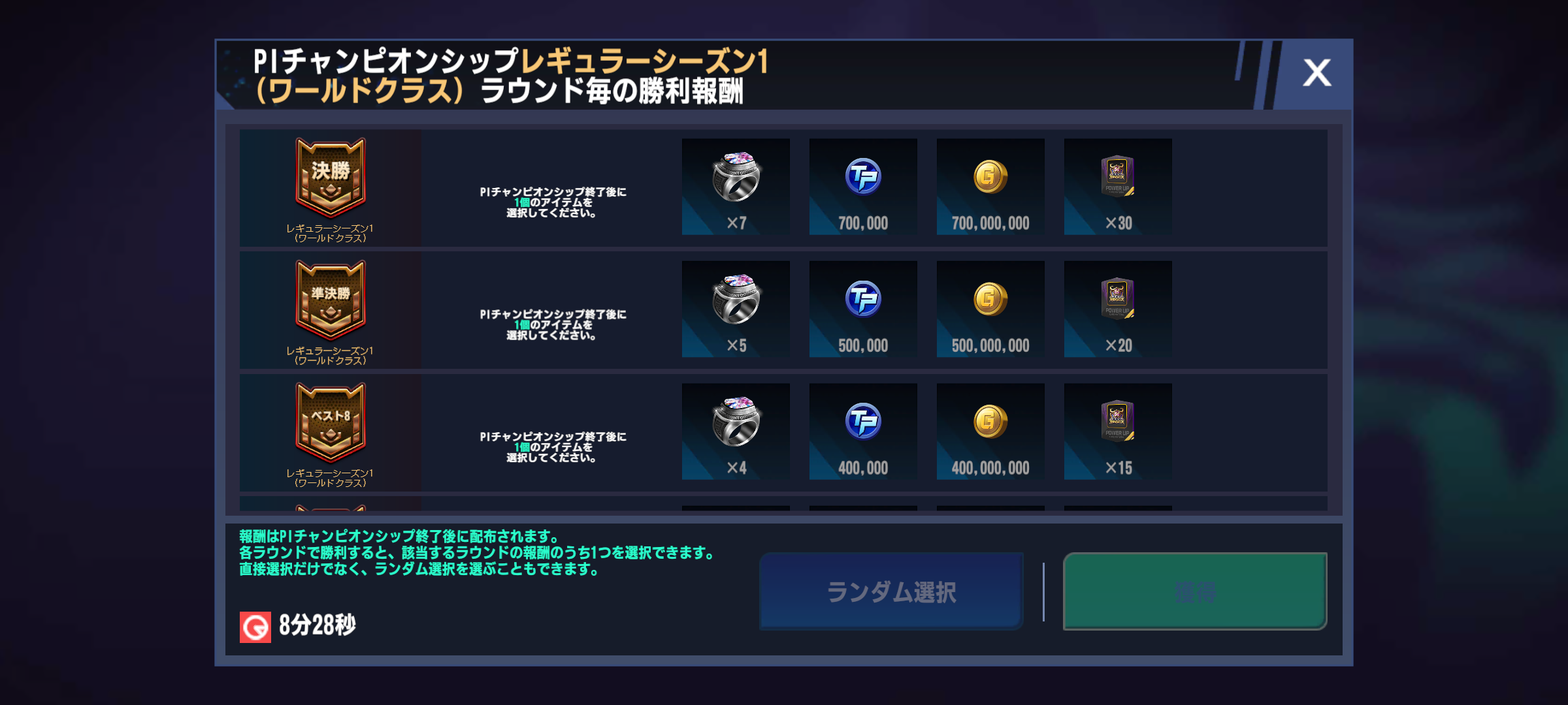*詳しくは[メインロビー]-[PLAY BALL]-[PIチャンピオンシップ]-[報酬確認]で確認できます。