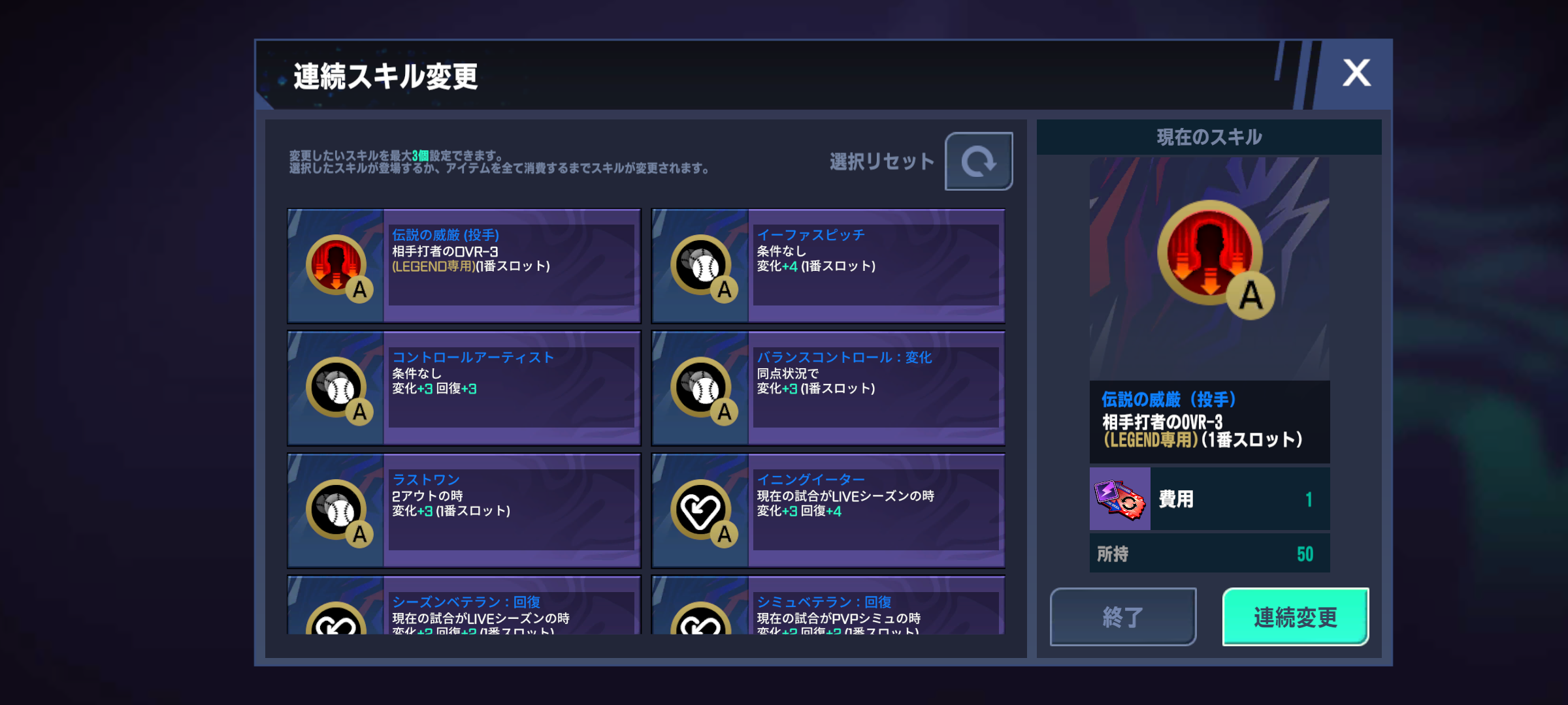 ・変更したいスキルを最大3つ選択でき、選択したスキルを獲得またはアイテムをすべて消費するまでスキル変更が連続で行われます。