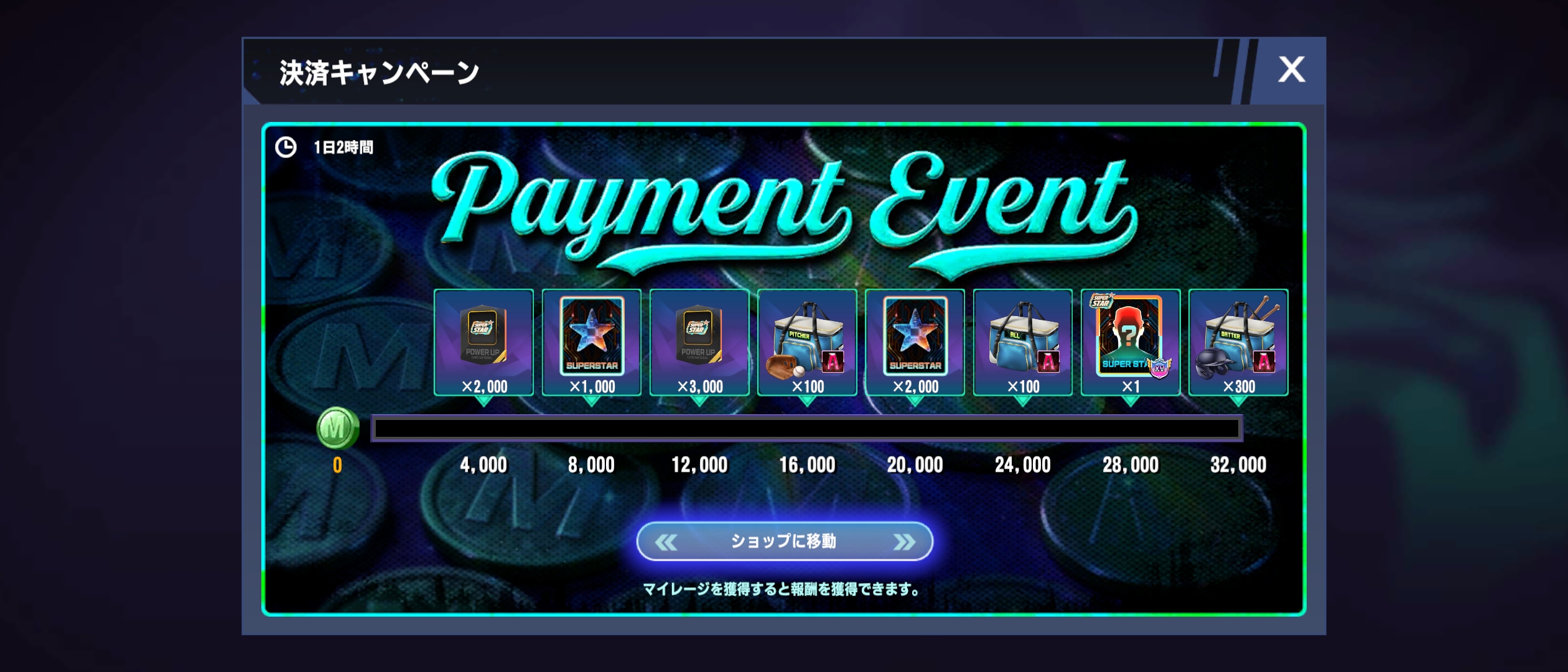 ・詳細:決済商品を購入してマイレージを獲得し、獲得したマイレージの区間に応じてキャンペーンアイテムを報酬として獲得可能
