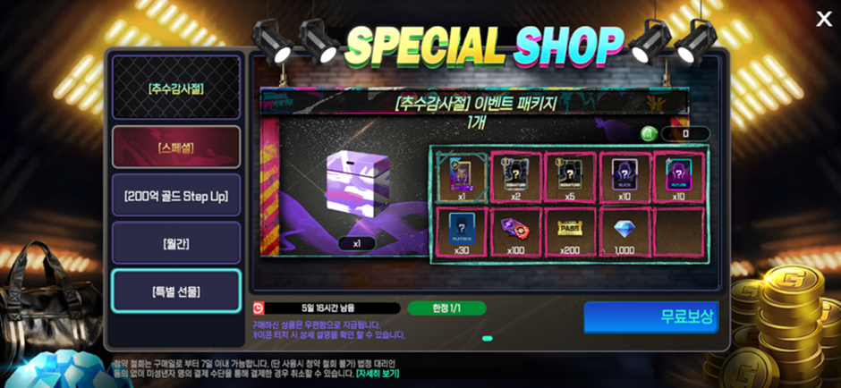 - [추수감사절] 이벤트 패키지는 [메인 로비]→[스페셜 상점]에서 무료로 획득 가능합니다.