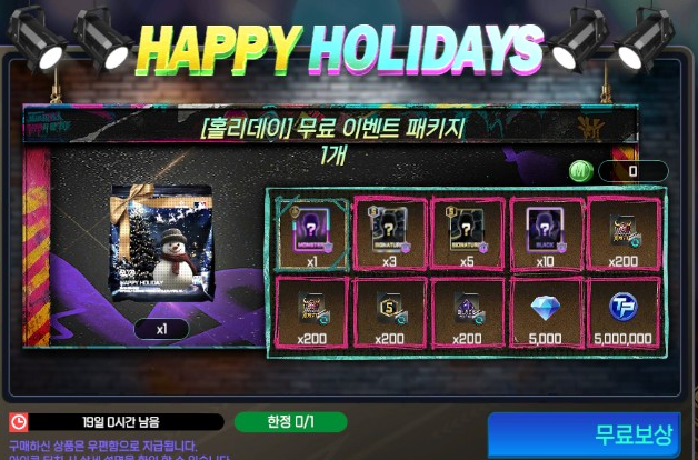 - [홀리데이] 무료 이벤트 패키지는 [메인 로비]→[HAPPY HOLIDAYS] →[특별 선물]에서 무료로 획득 가능합니다.
