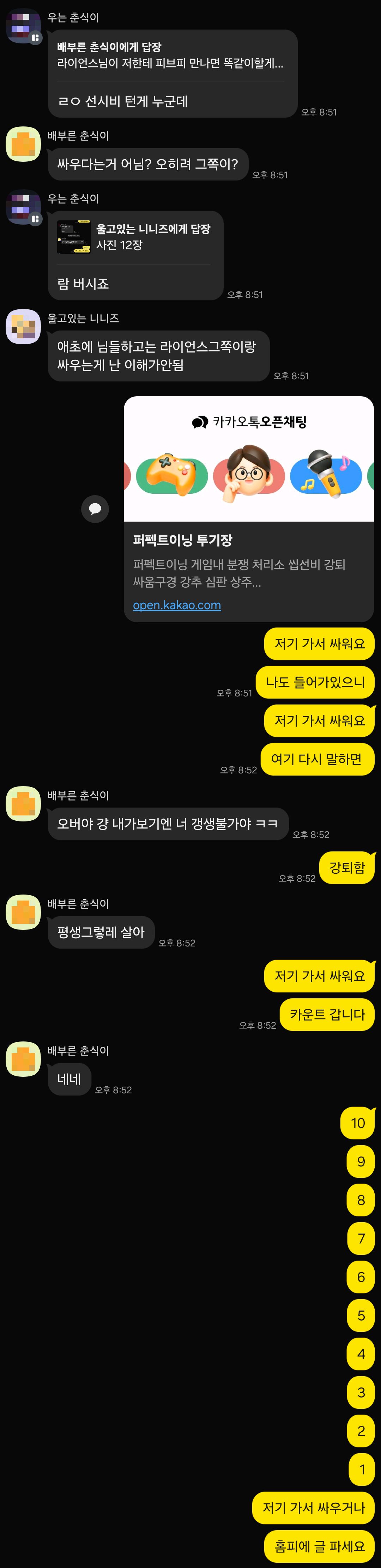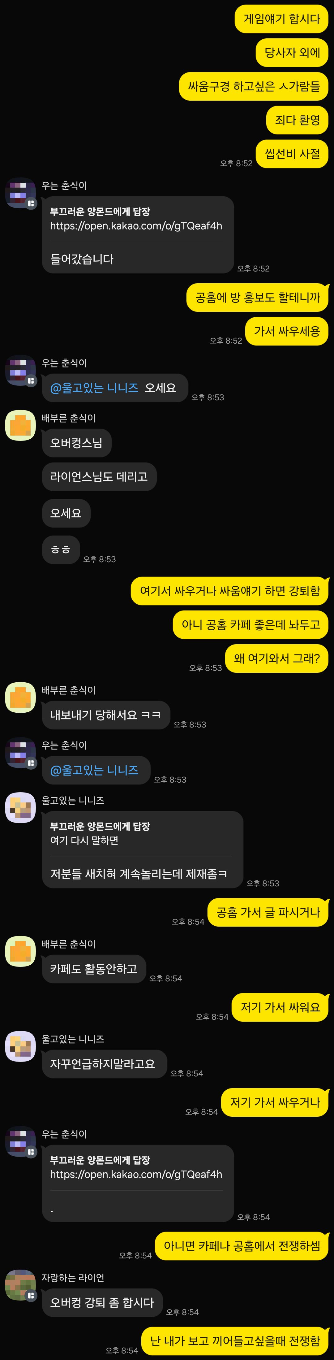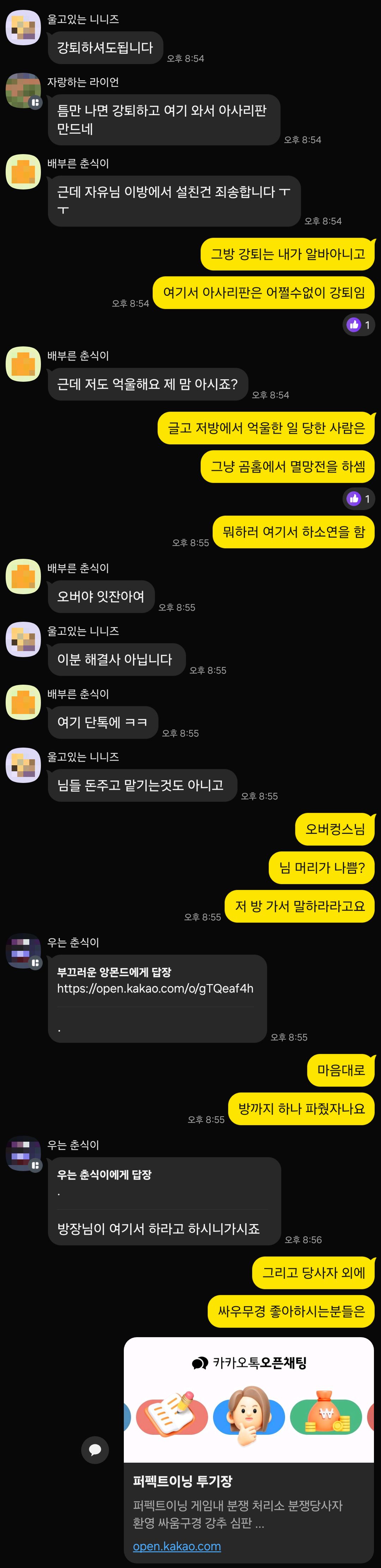 올 때마다 우리 챗방이 아사리판 나는 것을 도저히 견딜 수가 없어 투기장 오픈채팅 만들고 그리 보내버림