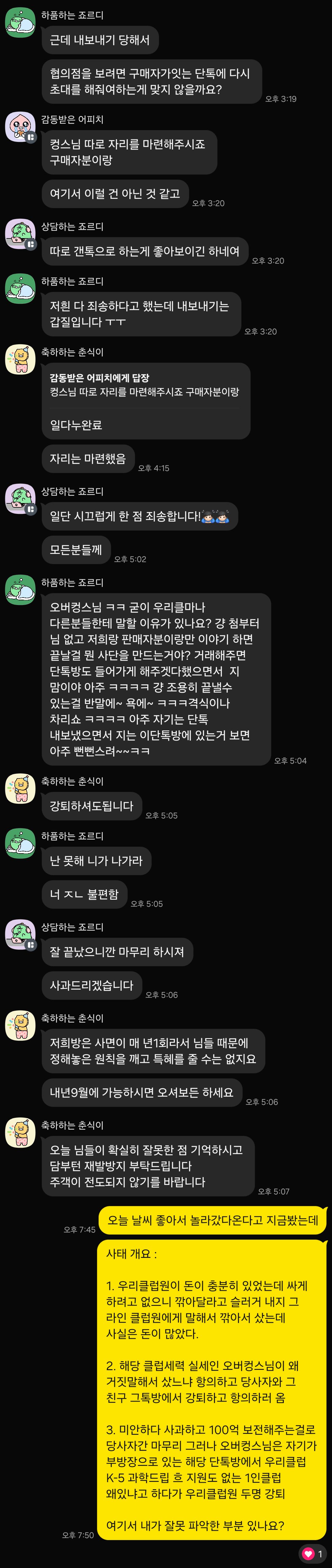 상황을 정리했고 당사자간 합의하였으나 그 과정에서 깎아달라고 한 멤버 둘을 자기들 단톡방에서 추방해버린 문제 때문에 또 아사리판이 남