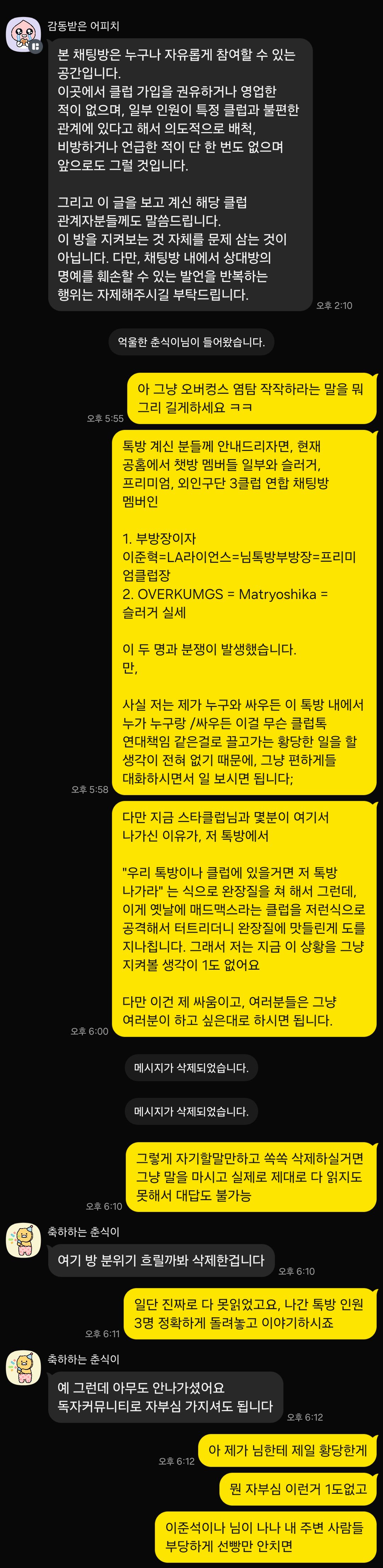 5. 당연히 4번처럼 황당한 이유로 클럽강퇴에 단톡방 강퇴를 당한데다, 다른 오픈채팅방에서도 욕을 들어먹게 된 우리 방 유저들은 분노해서 싸움이 발생했고, 저는 이런 황당한 이유로 인하여 또 게임얘기 잘 하던 방이 하루종일 개싸움 아사리판 나는 꼴을 볼 수 없어