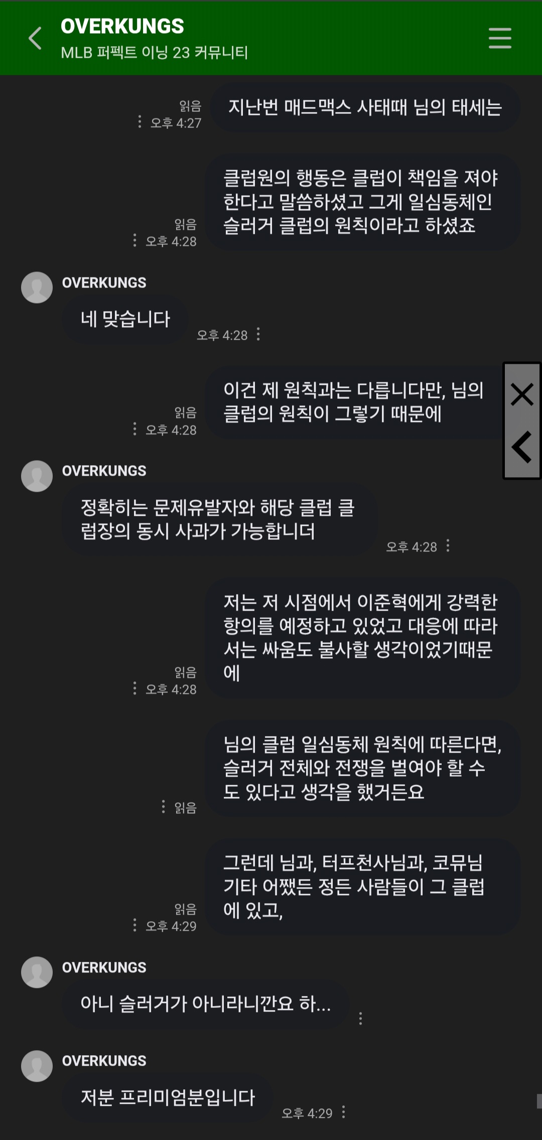 그래놓고서는 나한테 "왜 일개 프리미엄 신입의 행동을 슬러거 클럽의 문제로 몰고 가냐?"