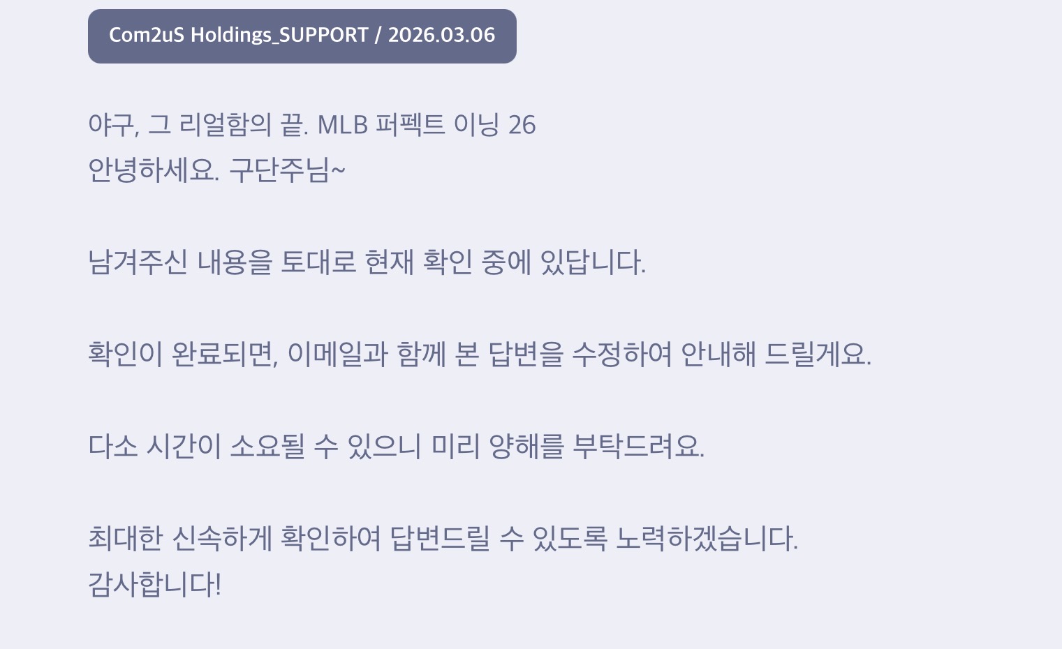 더불어, 3월 6일 및 3월 21일 인게임 문의를 통해 ‘슈퍼스타 로건 웹카드 4각 → 5각 각성 시도 시 오류 발생’ 건에 대해 문의를 접수한 바 있으나, 당시 “확인 완료 후 답변을 수정하여 안내하겠다”는 답변을 받은 이후 현재까지 별도의 후속 조치나 안내를 받지 못한 상태입니다. 이와 같은 대응 지연은 이용자 입장에서 문제 해결에 대한 신뢰를 저하시킬 수 있는 부분이라고 판단됩니다.
