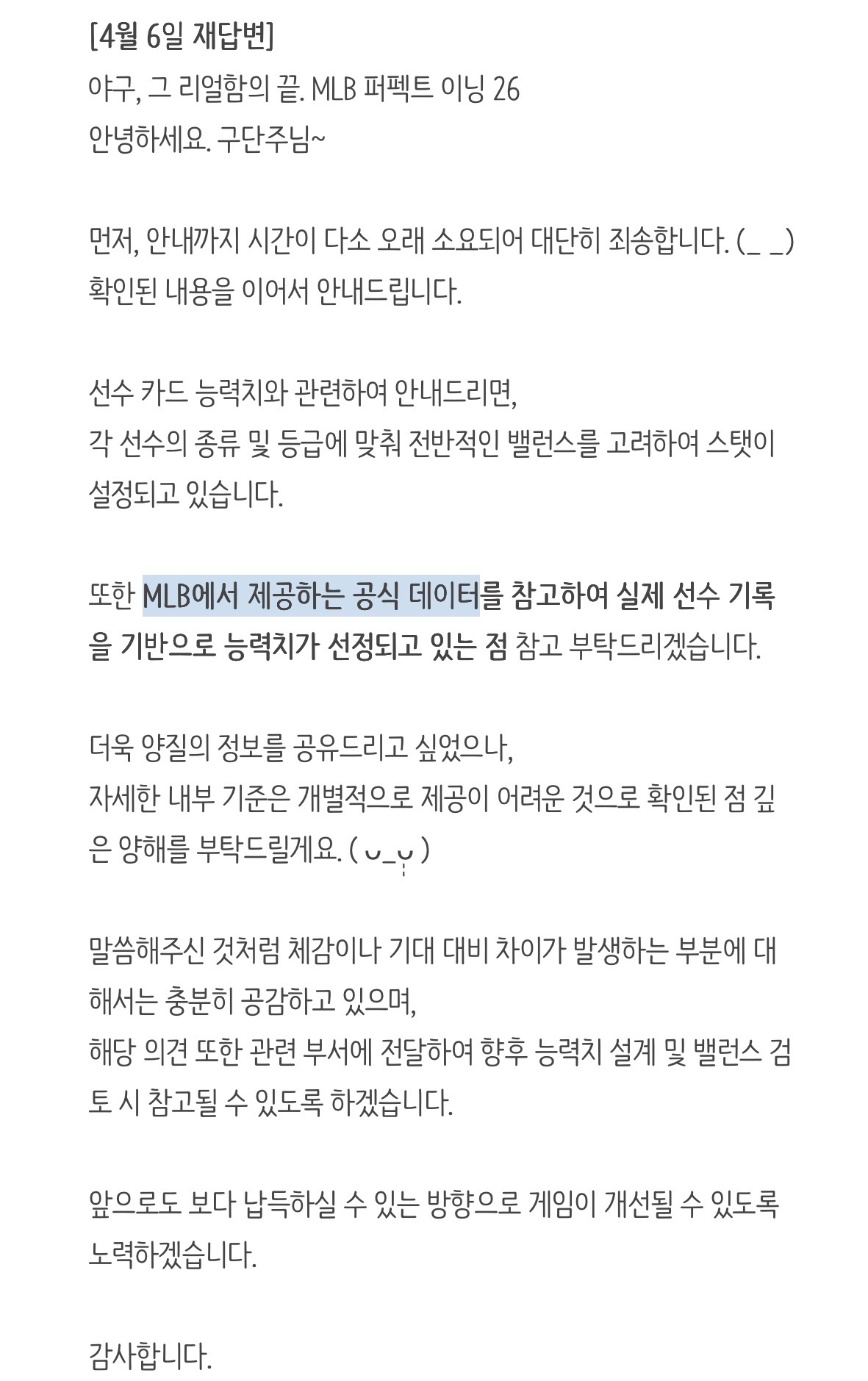 실제 MLB 기록 대비 엘리트 시즌 투수들의 스탯 괴리 문제를 지속적으로 건의해왔습니다.