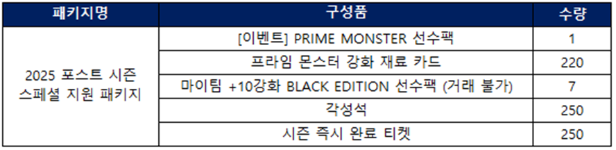 - 2025 포스트 시즌 스페셜 지원 패키지는 [메인 로비]→[추천 상점]에서 획득 가능합니다.