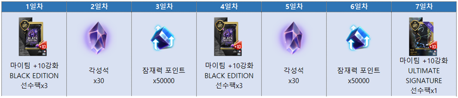 - 출석 적용 기간: 이벤트 기간 내 최초 로그인 시점부터 7일간 적용