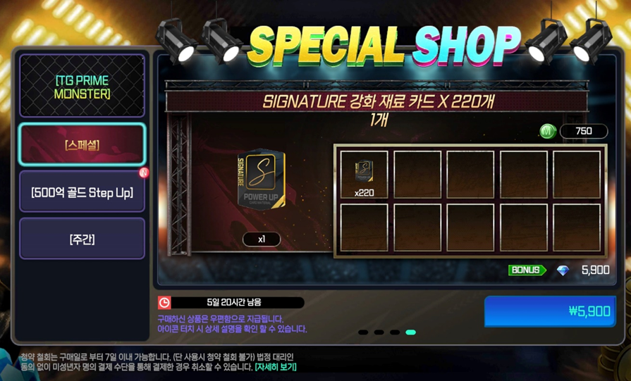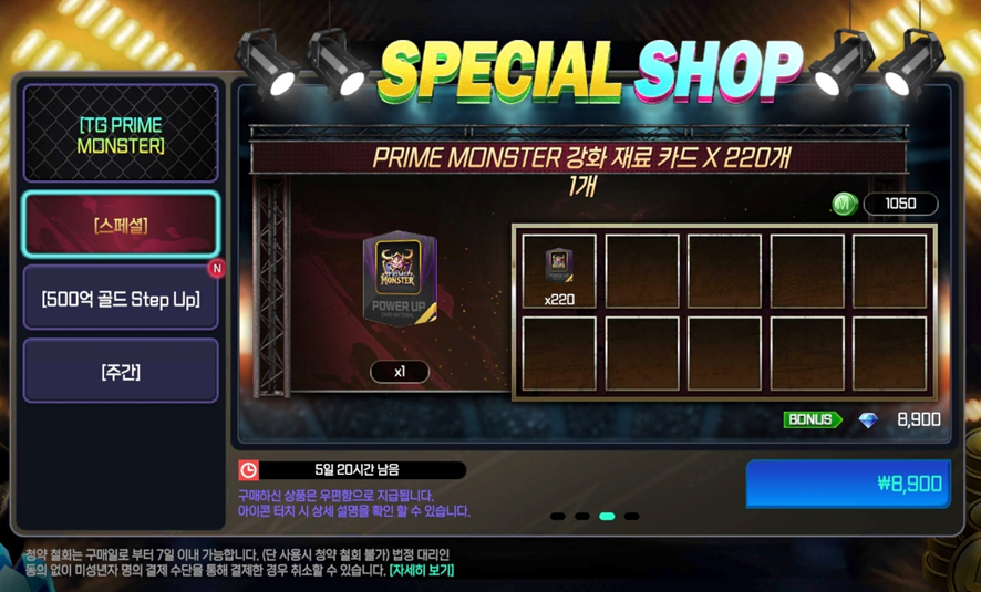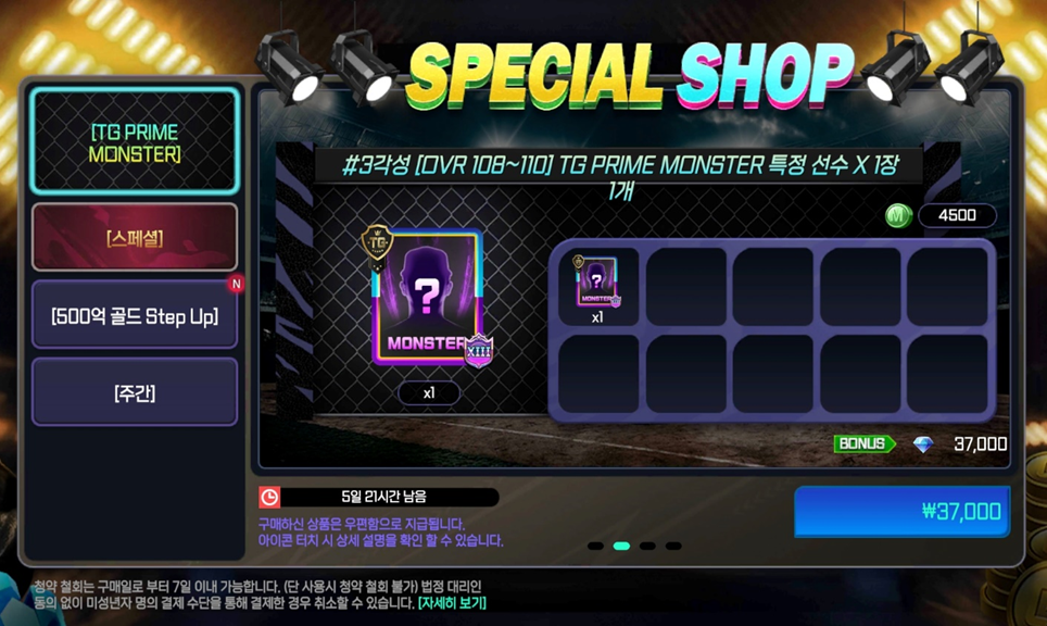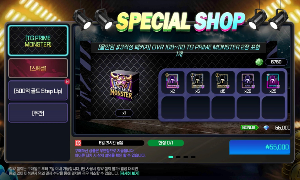 - 스페셜 패키지 ‘#3각성 [OVR 103~106] PRIME MONSTER 랜덤 선수팩 X 1장’ 상품이 ‘#3각성 [OVR 103~106] PRIME MONSTER 특정 선수 X 1장’으로 수정됩니다.