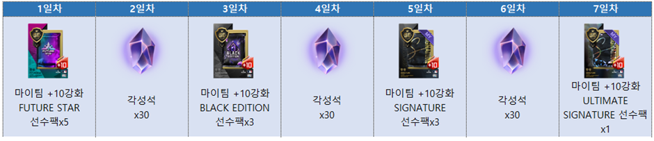 - 출석 적용 기간: 이벤트 기간 내 최초 로그인 시점부터 7일간 적용