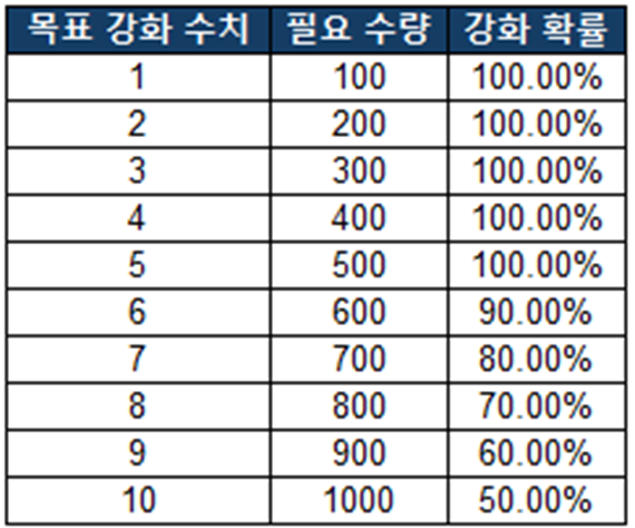 * 자세한 강화 확률은 인게임 강화 화면과 [메인로비] → [상점] → [확률보기] 및 확률표에서 확인 가능합니다.