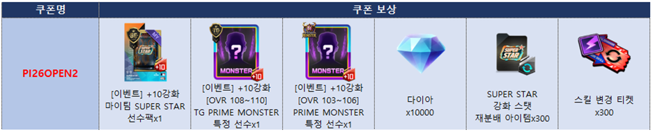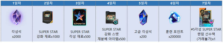 - 이벤트 내용: SUPER STAR 선수 카드 훈련 시, 대성공& 초월 성공 확률 2배 적용