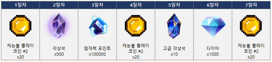 - 출석 적용 기간: 이벤트 기간 내 최초 로그인 시점부터 7일간 적용