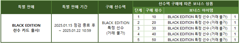 - BLACK EDITION 선수팩 제작 아이템의 제작 기간이 종료됩니다.