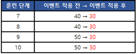 - 이벤트 내용: 7~10단계 훈련 초기화 시 다이아 소모 비용 30