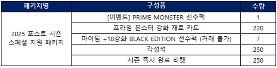 - 2025 포스트 시즌 스페셜 지원 패키지는 [메인 로비]→[추천 상점]에서 획득 가능합니다.