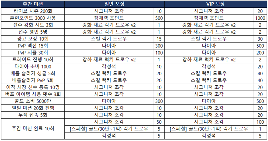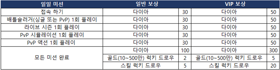 - 일일 미션/ 주간 미션의 미션내용과 보상이 변경됩니다.