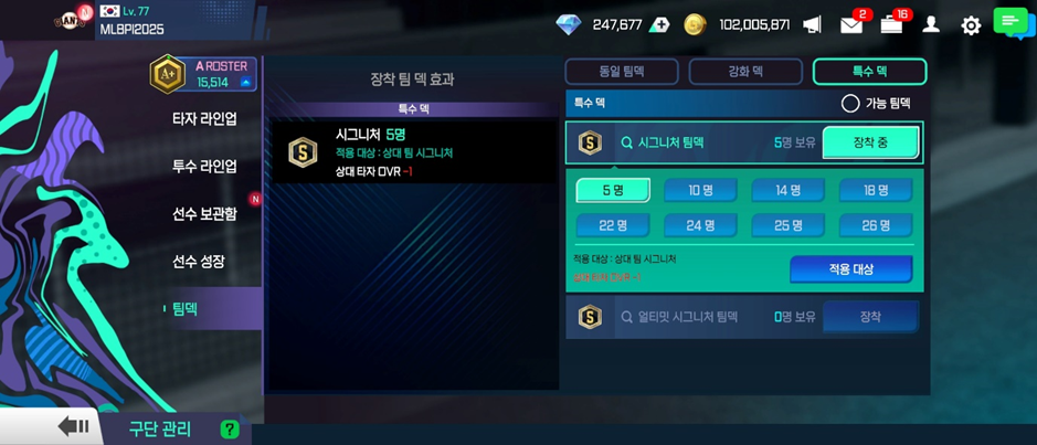 - 특수 팀덱 적용 시 팀덱 효과를 적용할 대상을 선택할 수 있습니다.