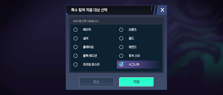 > SIGNATURE 팀덱: 상대방 라인업의 특정 등급 선택 가능