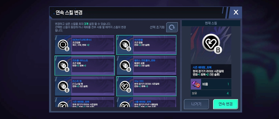 - 최대 3개의 변경하고 싶은 스킬을 선택할 수 있으며, 선택한 스킬이 획득되거나 재화를 전부 사용할 때까지 스킬 변경이 계속됩니다.