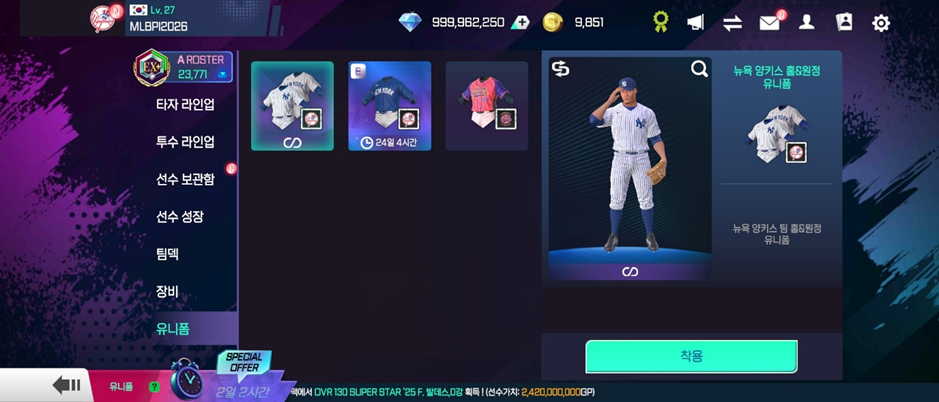 Ex) 내 구단이 NYY일 경우: 로스터 A – NYY 기본 유니폼, 로스터 B – NYY 얼티네이트 유니폼