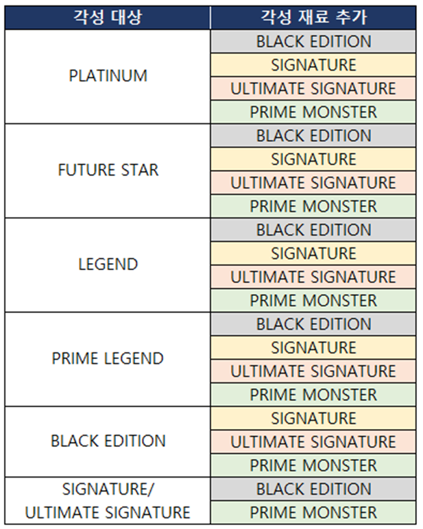 Ex) PLATINUM 선수 카드 각성 진행 시에 각성 재료로 BLACK EDITION, SIGNATURE, ULTIMATE SIGNATURE, PRIME MONSTER 선수 카드를 사용할 수 있습니다.