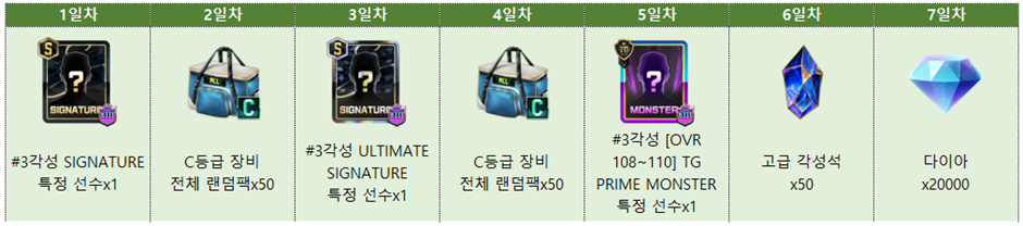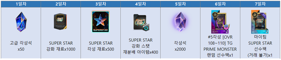 - 출석 적용 기간: 이벤트 기간 내 최초 로그인 시점부터 7일간 적용