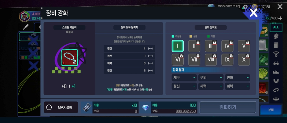 - A등급의 장비에서는 총 10레벨까지 강화 가능하며, 장비 강화 시 장비가 보유한 능력치 중 랜덤한 한가지 능력치가 상승하고 강화 성공 여부는 성공/ 대성공으로 분류됩니다.