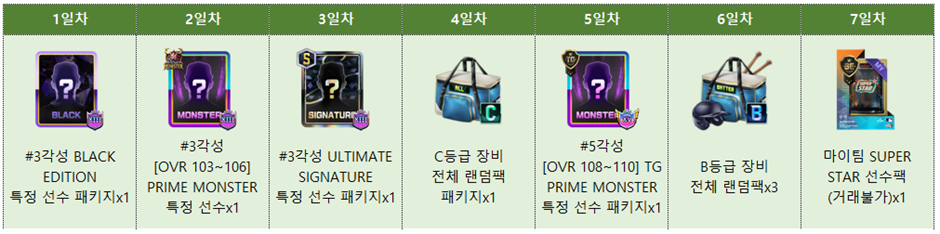 - 출석 적용 기간: 이벤트 기간 내 최초 로그인 시점부터 7일간 적용