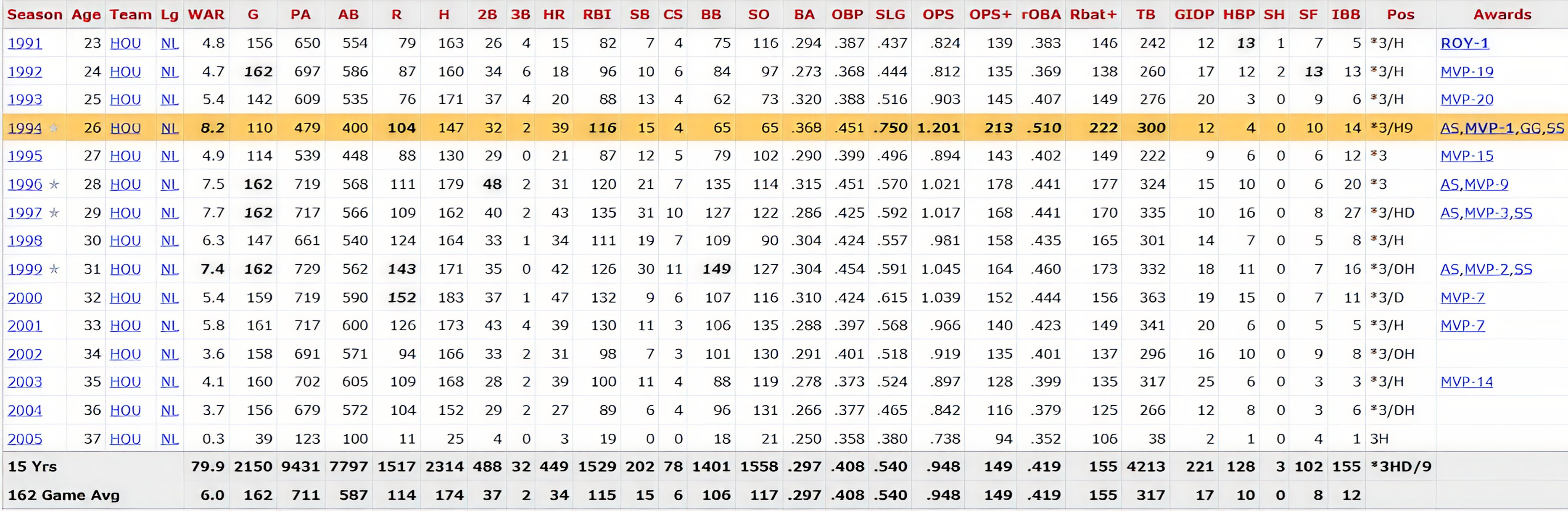 1994년 해당 시즌은 제프 배그웰이 압도적인 성적(39HR, 타율. 368, 출루율. 451, 장타율. 750 OPS 1.201 OPS+ 213 8.2 bWAR)으로 NL MVP를 획득한 시즌이다!