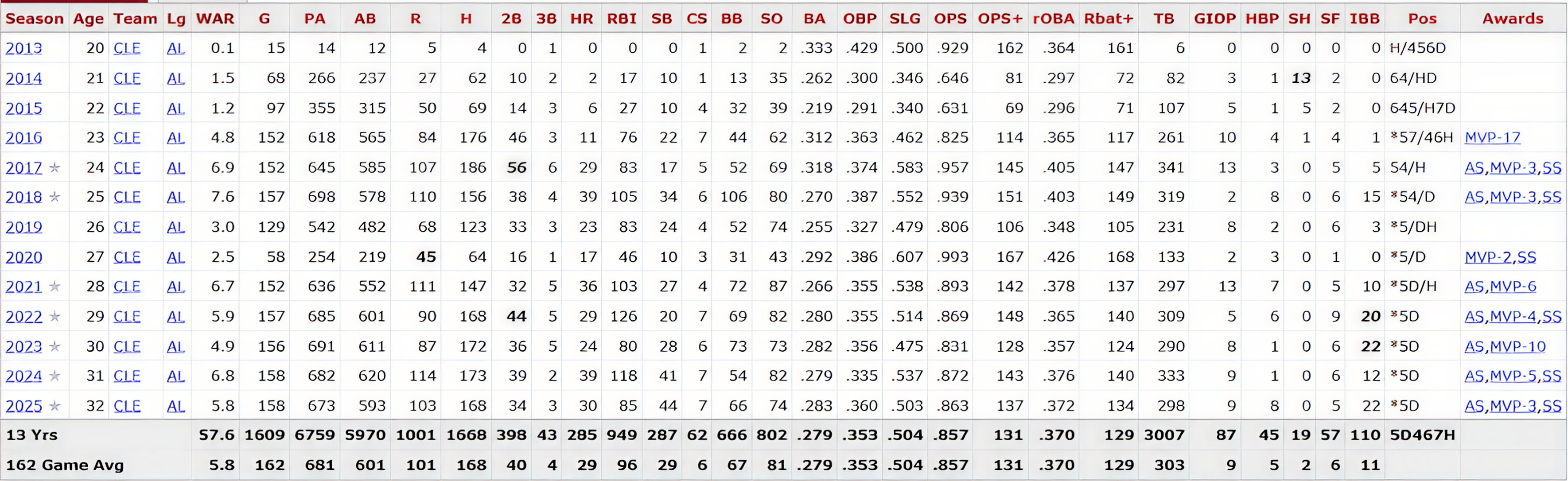 173cm의 작은 체구에도 불구하고 민첩한 움직임과 뛰어난 장타력으로 30-30 3회 등 2025시즌 현재까지 통산 285홈런, 1668안타, 949득점, 287도루, AVG .279, OBP .353, SLG .504, OPS .857, wRC+ 130, fWAR 57.7/ bWAR 57.6 의 엄청난 성적을 거두고 있는 클리블랜드 가디언스의 주전 3루수이자 프렌차이즈 스타이다.