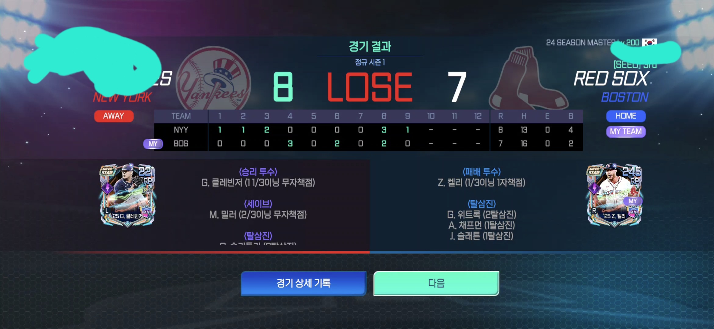 오늘 챔쉽 결승 클러치에서, 펜웨이 담장을 때리는 타구 2개에 주자들이 1베이스이상 추가진루를 하지 않는 버그가 한 게임에 두번이나 발생하여 1점차로 패배, 우승을 강탈당했습니다.