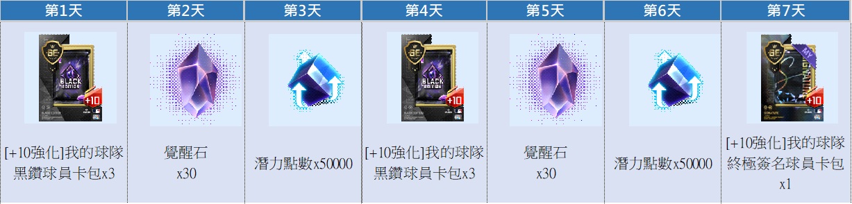 - 簽到套用期間:活動期間內首次登入日起7天內
