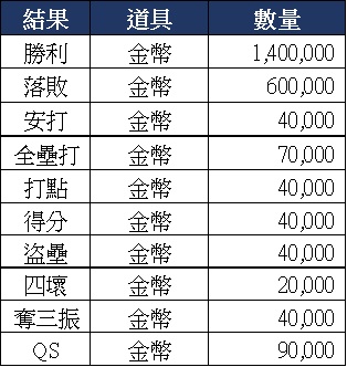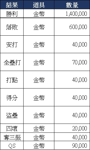 - 活動內容:完成賽季比賽、全壘打大賽、全明星賽後,可獲得2倍獎勵