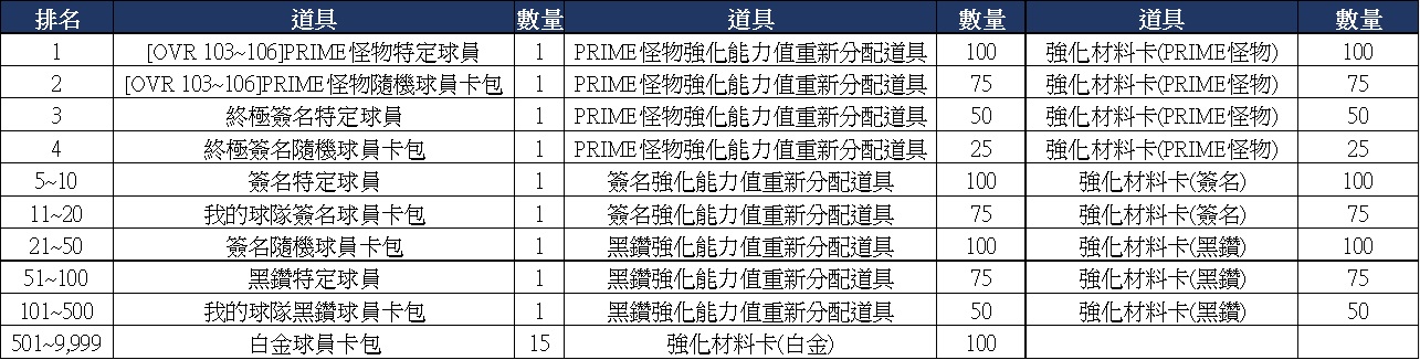 * 可透過[OVR 110]TG PRIME怪物隨機球員卡包及[OVR108~110]TG PRIME怪物特定球員道具獲得。