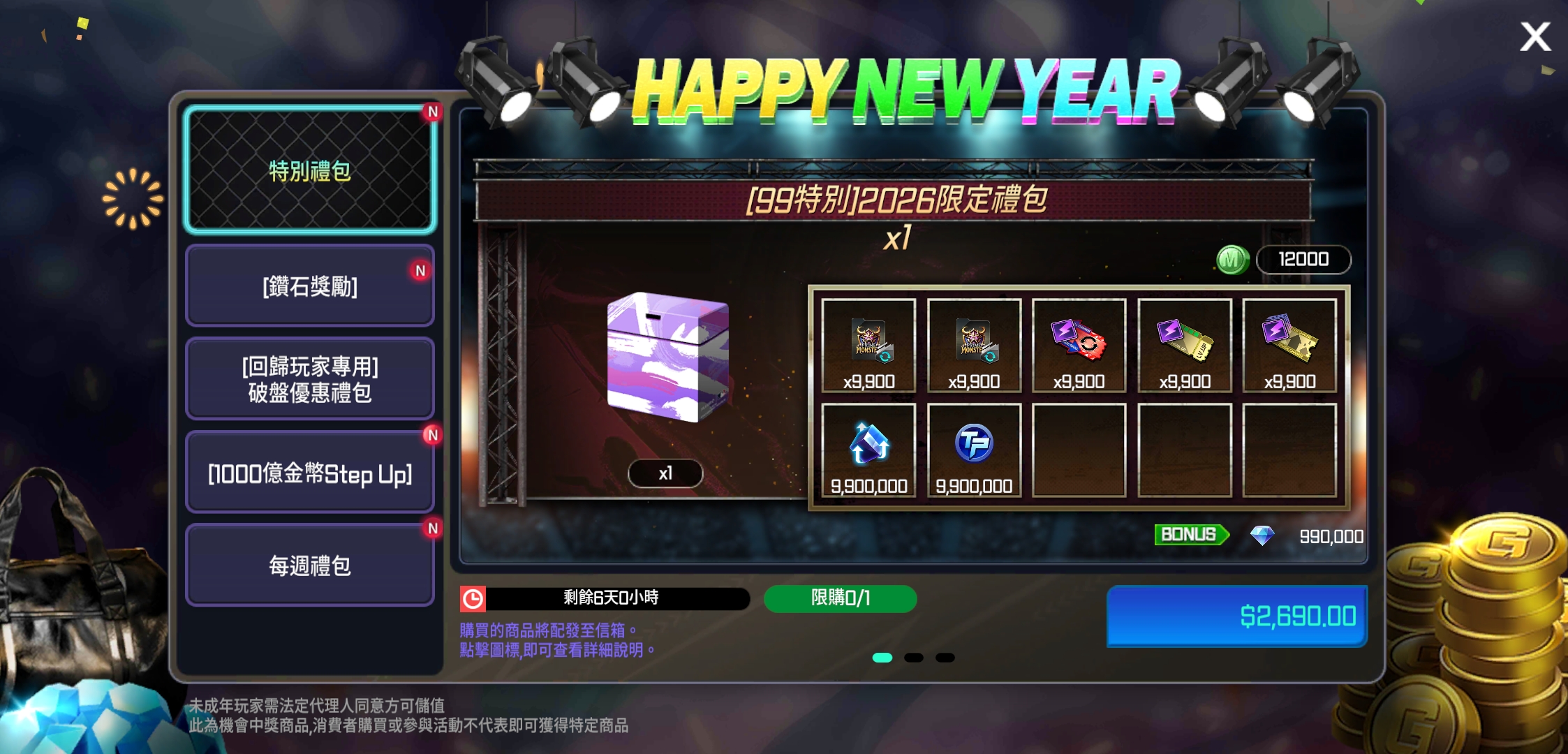 [99特別]2026限定禮包的獎勵鑽石數量將由99,000調整為990,000。