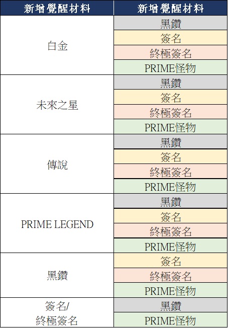 例) 進行白金球員卡覺醒時,可使用以下球員卡作為覺醒材料:黑鑽、簽名、終極簽名、PRIME怪物。