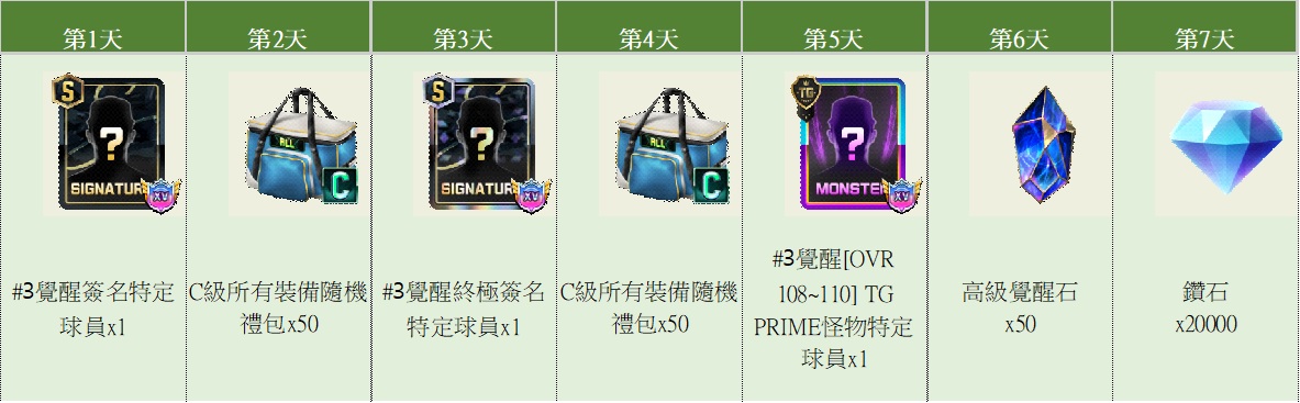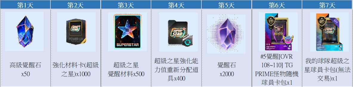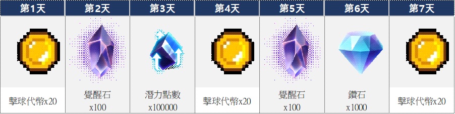 - 簽到套用期間:活動期間內首次登入日起7天內