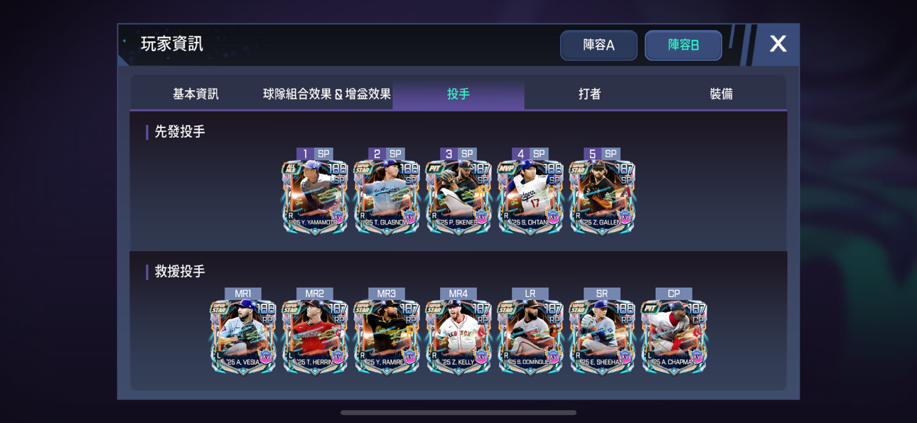例) 若我的球隊是NYY: 陣容A – NYY基本球衣、陣容B – NYY備用球衣