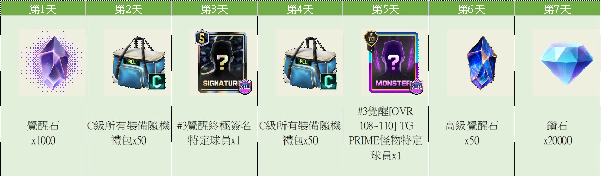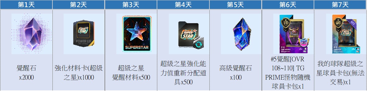 - 簽到套用期間:活動期間內首次登入日起7天內
